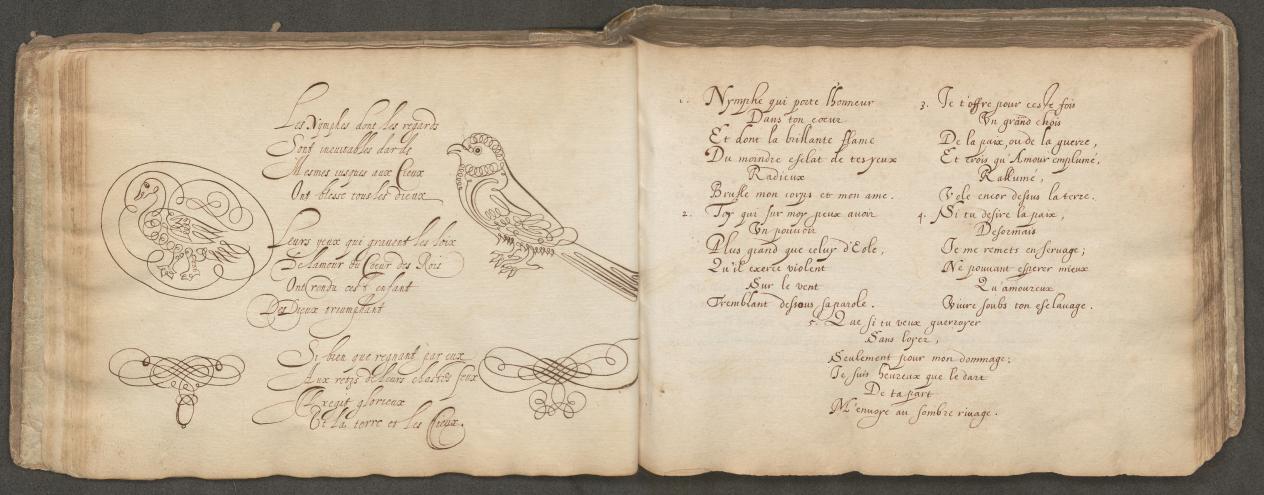 Het handschrift is hoofdzakelijk een liedboek, met maar liefst 65 liederen en recitatieven. Het zijn bijna allemaal Franse liederen waarin de hoofse liefde zegeviert. Het album voor Dorothea de Berti bevat voorts een tiental gedichten, vier fraaie figuurgedichten, enkele gouaches en aquarellen, drie met de hand getekende prenten en een twintigtal met zwierige krullen versierde figuren. Dit prachtige album in handschrift is een ode aan de liefde. De teksten en de illustraties zitten boordevol liefdessymboliek.