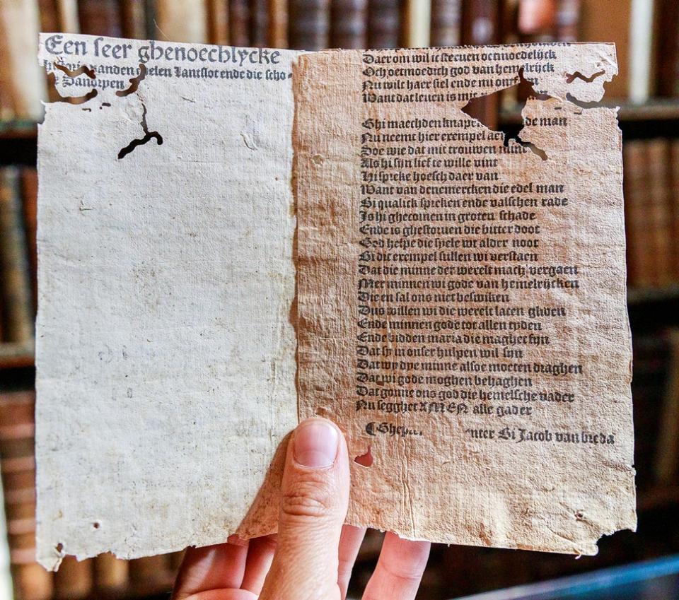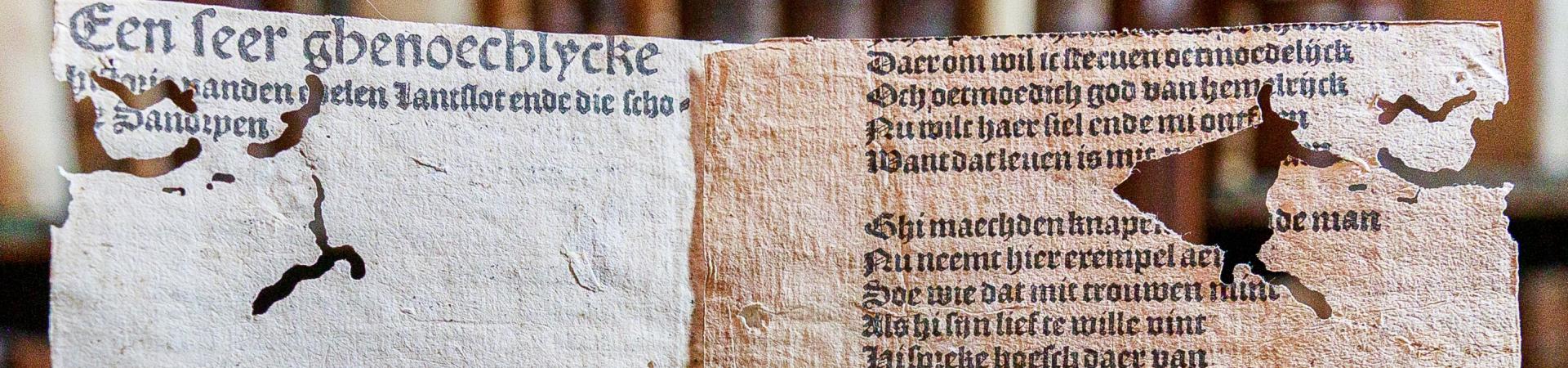 Jorn Hubo werkt mee aan het project Medieval Manuscripts in Flemish Collections, dat een databank ontwikkelt van alle middeleeuwse handschriften die zich in Vlaanderen bevinden. Tijdens een bezoek aan de Erfgoedbibliotheek om onze collectie oude boek- en handschriftfragmenten te bekijken, ontdekte het projectteam een colofon en titelpagina van Een seer ghenoechlycke historie vanden edelen Lantslot ende die Schone Sandryen.