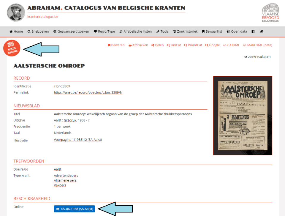 Hoe weet je of er gedigitaliseerde edities van een bepaalde krant zijn? Deze kranten herken je in Abraham door de aanwezigheid van een oog- of slot-icoontje (voor kranten met open of beperkte online toegang). Een afbeelding van een voorpagina is ook een signaal dat de krant is gedigitaliseerd. In het record van de krant zelf verwijzen de rode knop ‘Bekijk online’ en de blauwe link bij ‘Beschikbaarheid’ je door naar het platform dat over edities van de krant beschikt.