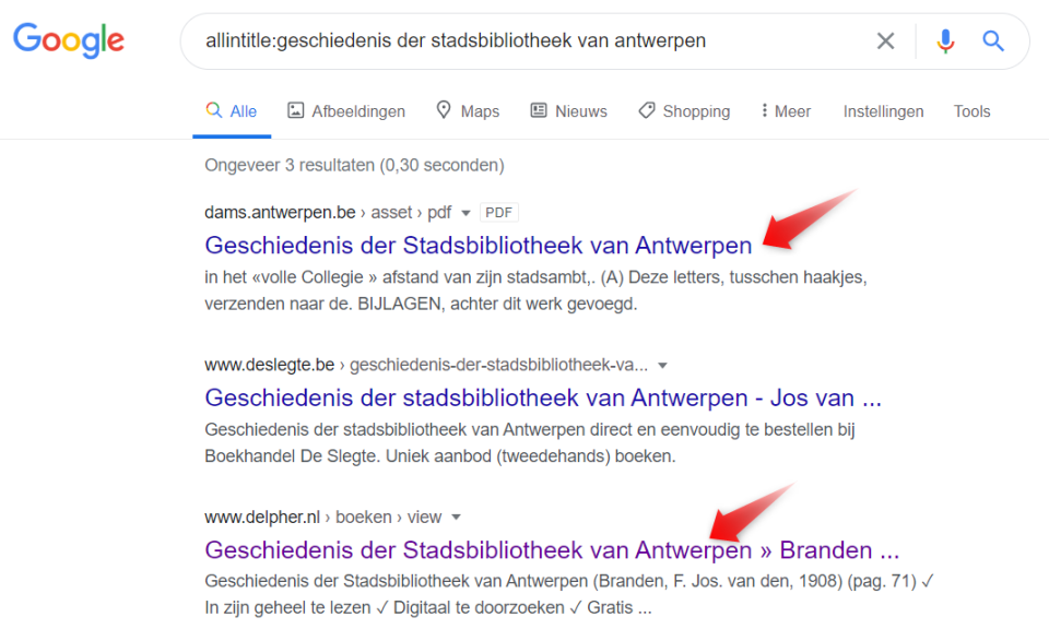 - In Zoektips #4 zagen we al dat de titel van een artikel vaak opgenomen wordt in het adres van de bewuste webpagina. Even vaak is dat echter niet het geval. Hier is nog een andere manier om uitsluitend in titels van webpagina’s te zoeken. Als je de titel van het werk dat je zoekt kent, geef hem dan volledig in: ‘allintitle:geschiedenis der stadsbibliotheek van antwerpen’. Het zoekresultaat is bevredigend: in de eerste drie komen we al uit bij gratis digitale exemplaren van het boek op dams.antwerpen.be en delpher.nl (zie verder):