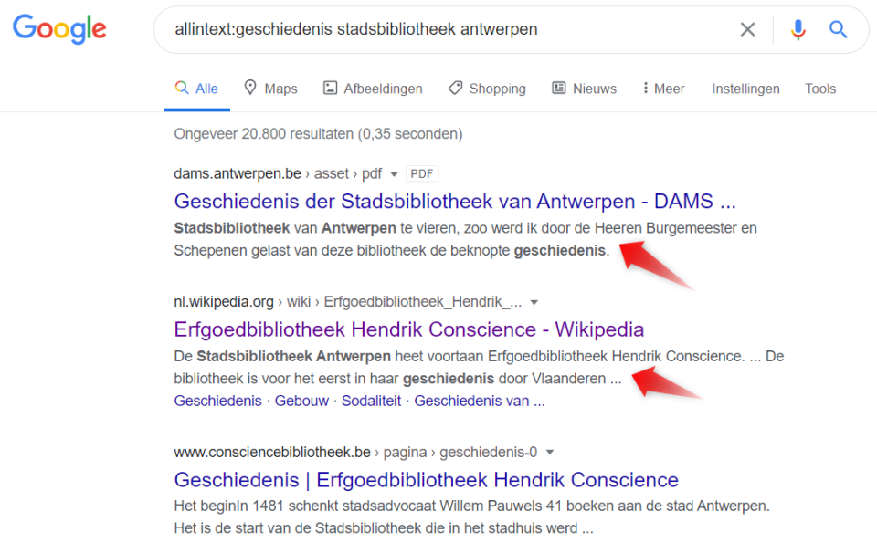 - Wil je niet in titels, adressen, enz. zoeken, maar juist alleen in de bodytekst van webpagina’s? ‘allintext:geschiedenis stadsbibliotheek antwerpen’. Ook deze zoekopdracht geeft een goed resultaat: