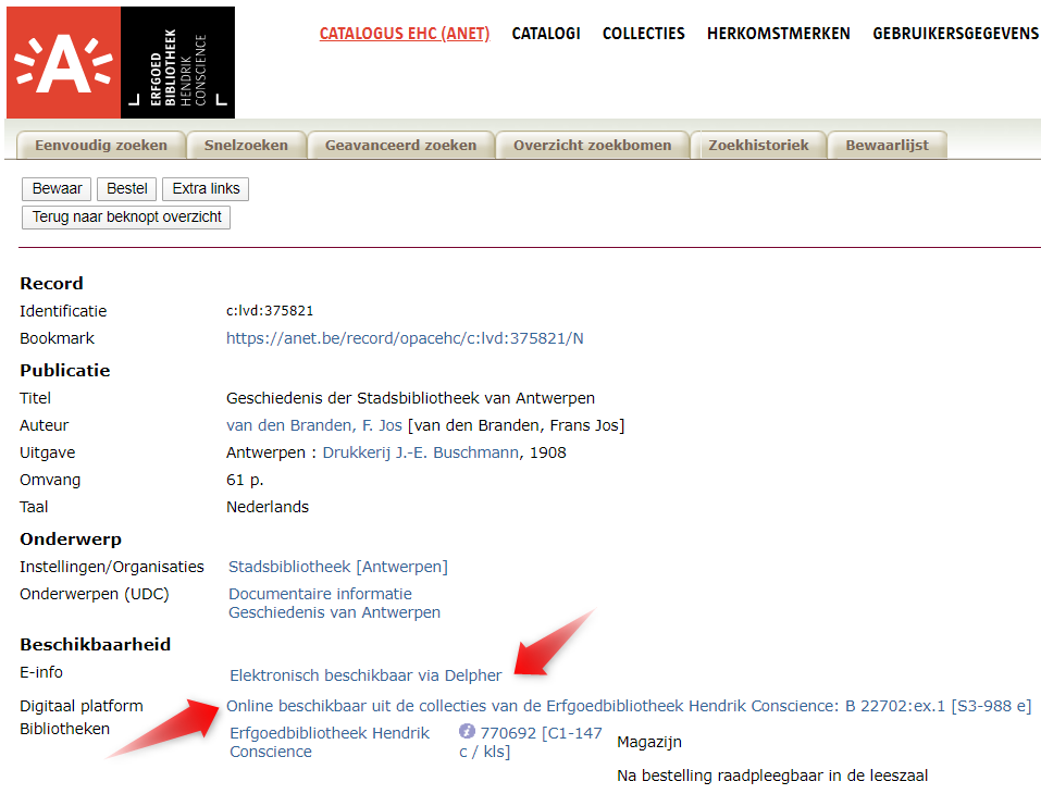 - In de catalogus van de Erfgoedbibliotheek Hendrik Conscience is het steeds aangeraden om in de beschrijving eens te controleren of het werk niet toevallig elektronisch beschikbaar is: