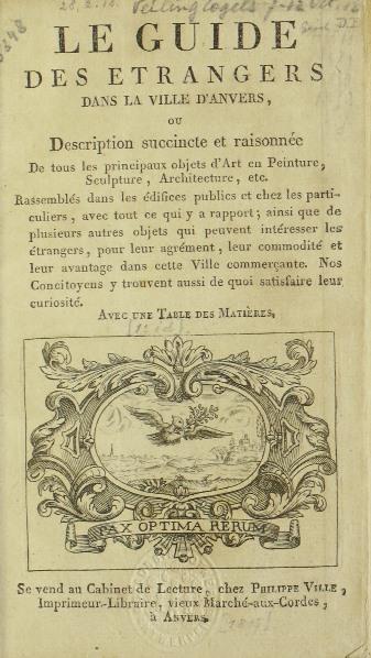 Dergelijke reisgidsjes rolden tot in de negentiende eeuw zelden of nooit in Antwerpen van de persen. Le Guide des Etrangers dans la ville d’Anvers (Antwerpen 1817) is de spreekwoordelijke uitzondering op de regel. Dat beduimelde reisgidsje is ook in andere opzichten bijzonder. Eerst en vooral is het een voorbeeldje van een nieuw subgenre. Aanvankelijk waren stadsgidsjes immers schaars. Landen – of tenminste regio’s – vormden lange tijd de favoriete schaal van reisgidsen, chorografieën en andere geografische literatuur. Pas in het midden van de achttiende eeuw verschenen er ook gespecialiseerde gidsjes voor Rome, Parijs of Londen op de markt. Antwerpen kwam op die lijst terecht dankzij haar barokke kunstpatrimonium, dat heel wat Britse, Franse, Duitse en Nederlandse connoisseurs aantrok. Uit de ondertitel van Le Guide blijkt immers dat die étrangers vooral afkwamen op les principaux objets d’art et de peinture, sculpture et architecture, waarbij vooral de meesterwerken van Rubens en Van Dyck een onweerstaanbare aantrekkingskracht uitoefenden. Kunstkenners in spe kregen in gidsjes zoals Le Guide ook handvaten om die doeken in correcte termen – compositie, dessin, koloriet, perspectief, clair-obscur en ander jargon – te beoordelen. Minder enthousiast waren die reizigers over de stad zelf. Antwerpen werd al sinds de late achttiende eeuw beschreven als een vervallen en doodse metropool, waar de tijd sinds de late zestiende eeuw – met de Val van Antwerpen in 1585 – stil was blijven staan.